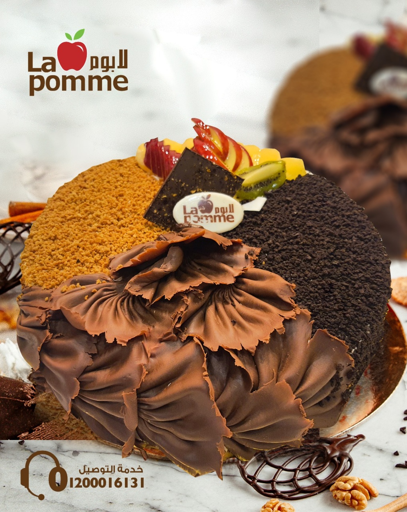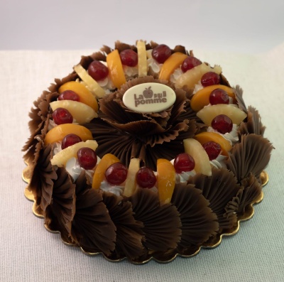 نصف الشيكولاته عباره عن سبونج شيكولاته وكريمه شيكولاته مغطي بالشوكولاته والنصف الاخر سبونج فانيليا وكريمه لباني ومغطي بالفواكه الطازجة