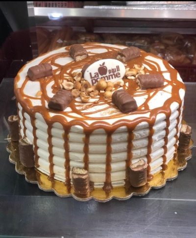 طبقات من الفادج الأبيض واسبونج فانيليا مع راق سابليه محشوة كريمة مربي حليب وكروكاند بندق مغطاة بصوص كراميل مع قطع تويكس
