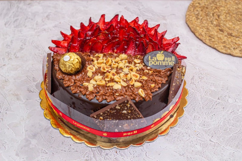 نص فادج تشوكليت محشوة كريمة شيكولاتة  فريروروشيه الغنية بمكسرات البندق والمغطاه جلاس شيكولاته وبندق و قطع شيكولاته فريروروشيه